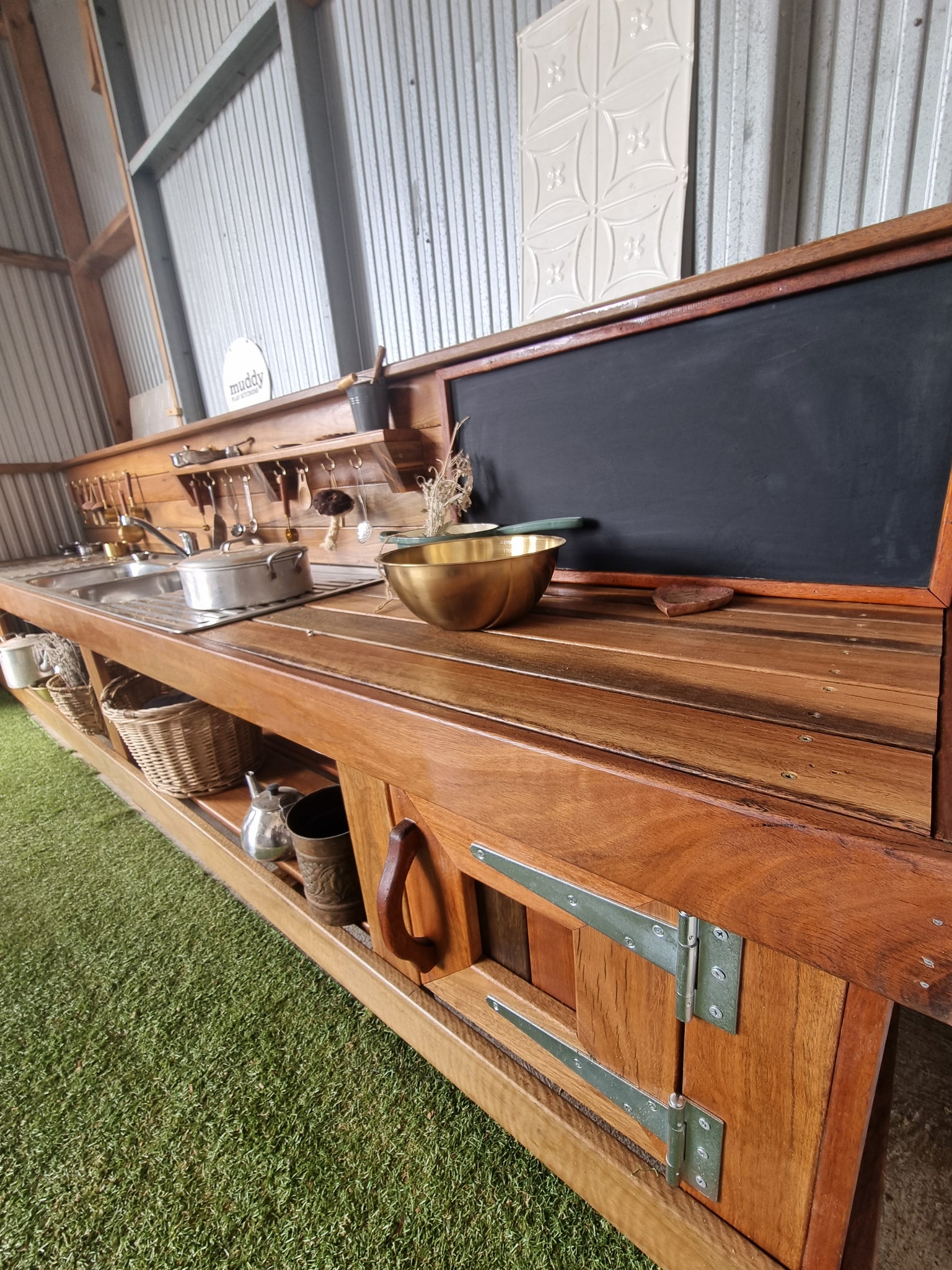 This 3m mud kitchen is built with hardwood timber. Outdoor timber & fittings used.